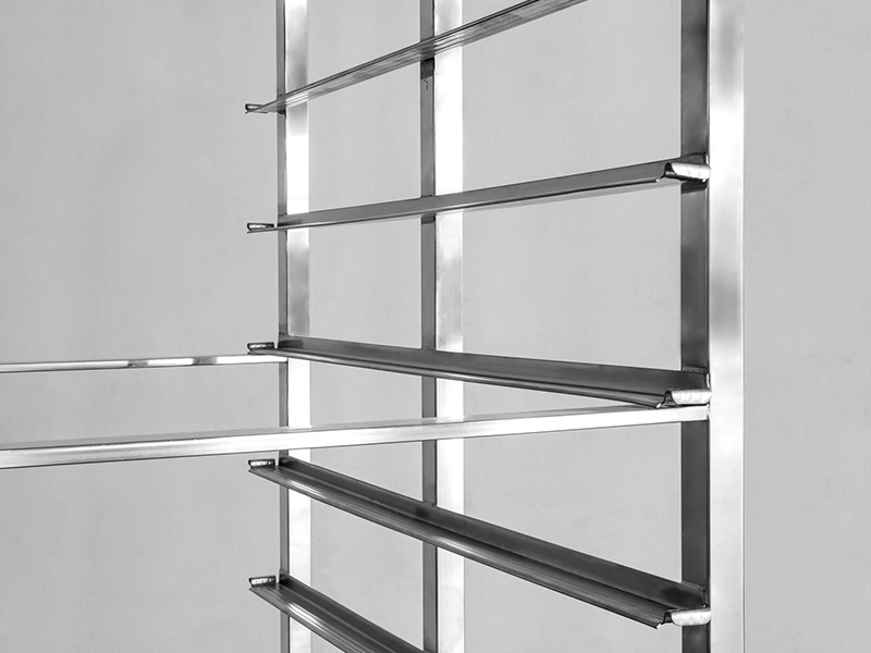 - Propiedades del material: Este carro bandejero está fabricado con tubos cuadrados de acero inoxidable, lo que le confiere una estabilidad y durabilidad superiores, ideal para uso industrial intensivo y a gran escala.